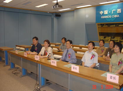 广西分会场的领导正在通过视频会议系统与上海主会场交流意见
