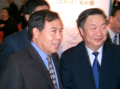 (图为信产部部长王旭东在教育部科技发展中心主任李志民陪同下参观CERNET展示区) ![]() |