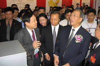 | CERNET专家委员会主任吴建平教授向政治局委员、国务院副总理曾培炎、 教育部副部长赵沁平介绍中国下一代互联网建设情况 |