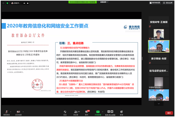 河南分公司副总经理张东飞对2020年教育信息化和网络安全工作要点和2020年高招网站安全检测工作进行了文件解读,详细介绍了高招检测各高校应上报的信息、上报流程、初检复检内容和检测时间节点等;同时还将CERNET目前的建设状况以及各项服务内容做了详细汇报,使各高校老师能够更加充分认识到接入CERNET的优势以及教育专网建设的重要性和必要性。