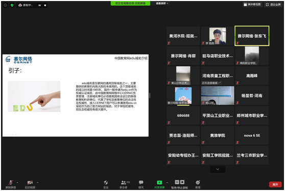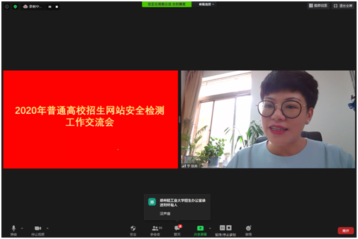 为使河南省各高校顺利完成2020年高校招生网站安全检测工作,河南分公司结合教育部学生司相关要求,于6月23日下午通过ZOOM视频会议的形式举行了“2020高校招生网站安全检测工作交流会”,来自全省高校的120余名招生负责老师应邀参加。