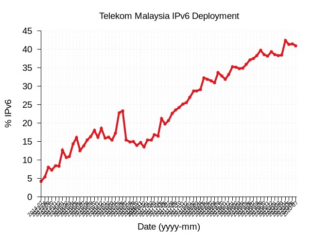 从图15的曲线图中以看出,3BB IPv6部署率在三年多的时间内实现了从0到64%的突破。Telekom Malaysia是马来西亚唯一的电信公司,目前IPv6的部署率接近45%(图16)。
