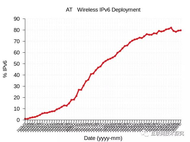 图2显示了T-Mobile在IPv6部署方面的成果。AT&T美国第二大移动运营商,图3显示AT&T Wireless在2015年开始启用IPv6,到2020年IPv6使用率已经突破了80%。