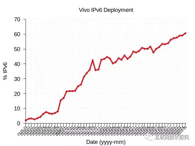 在巴西,当地最大的运营商Vivo于2015年10月开始推行IPv6,5年内IPv6部署率从0增长至60%(图4)。