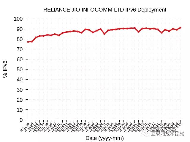 在亚洲方面,日本运营商SoftBank在五年内就将IPv6部署率从4%提升到了46%(图7)。印度的电信运营商Reliance Jio则在短短几年内就增长到了90%(图8)。