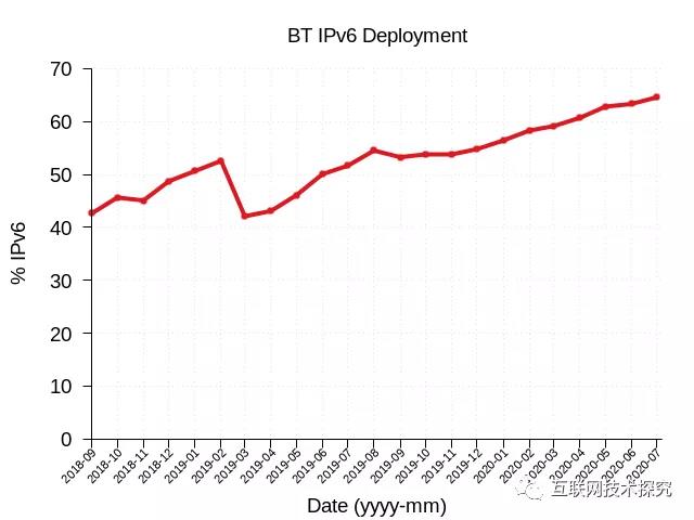 在欧洲方面,Nethys(VOO)是比利时当地的有线电视运营商,图12显示,VOO从2013年就开始支持IPv6,并在2020年将IPv6部署率提升到了80%。BT-British Telecom是英国最大的电信运营商,英国所有的电话线都是要通过他们进行开通。