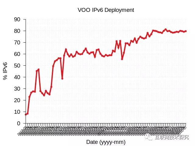 因此,他们的IPv6流量增加显著,超过65%的用户使用IPv6(图9)。美国运营商AT&T的IPv6部署率达到了80%(图10)。