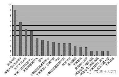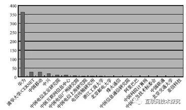 如表6所示,其中网络设备公司有华为、中兴、烽火通信;运营商有中国电信、中国移动、中国联通;大学有清华大学、北京邮电大学、北京交通大学、浙江工商大学;网络公司有阿里巴巴、亚信科技;研究机构有电信传输研究所、中国信息通信研究院、中国科院计算所;网络资源注册机构有中国互联网信息中心;政府机构有中国信息技术标委会。中国发表RFC数量以及平均RFC引用数量的分布如图1和图2所示。