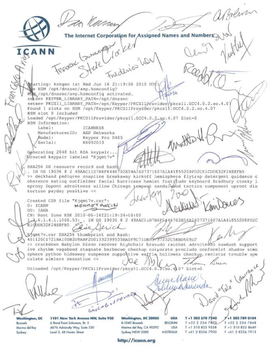 后来,有人提出:既然是可信任的代表,为什么还需要证明是可信任的?而且,密钥拿来拿去,也容易丢失。自此以后,ICANN改了规则,只需要持有者发送承诺函件表示密钥的安全和完整即可。
